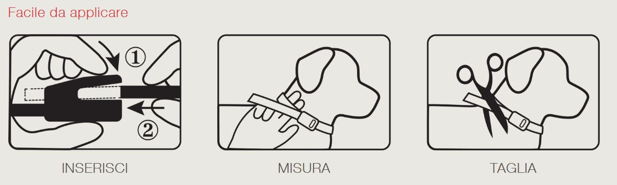Consigli di utilizzo Rimuovere il collare dal sacchetto di protezione appena prima dell’utilizzo. Regolare il collare attorno al collo dell’animale senza stringerlo eccessivamente né lasciarlo troppo lento: tra il collare e il collo del cane deve essere possibile inserire due dita. Tagliare la parte in eccesso di oltre 5 cm. Il collare è inodore.