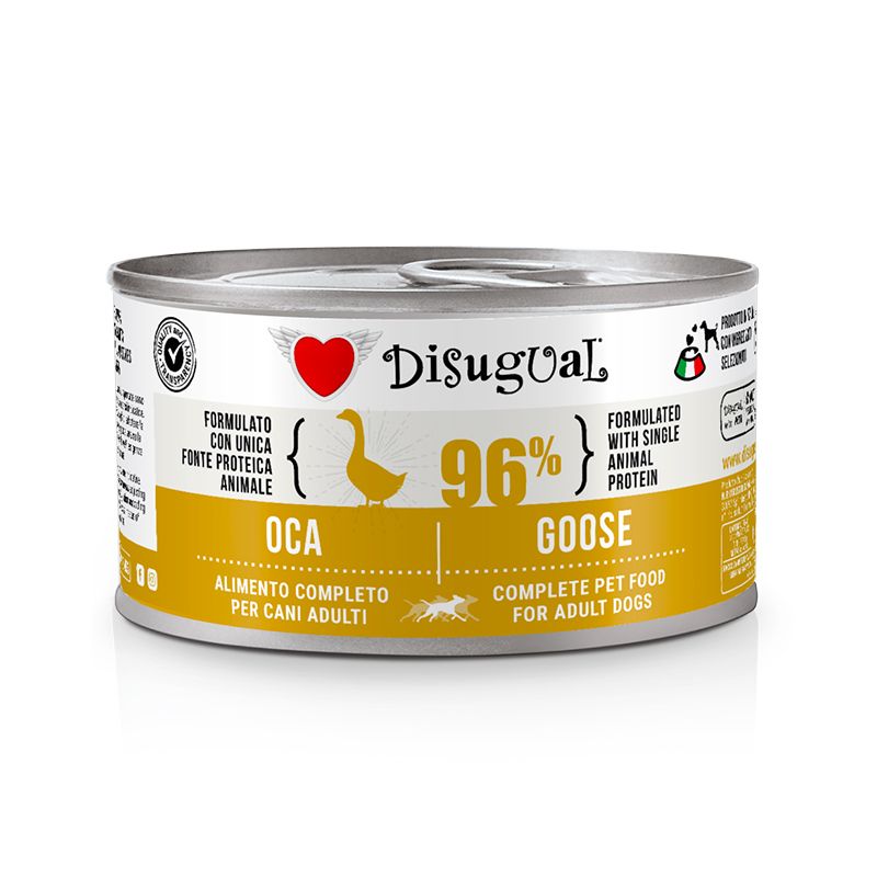 Disugual è un alimento completo, formulato con un'unica fonte proteica animale, adatto a cani di tutte le taglie con normale livello di attività fisica. Il prodotto è formulato con il 96% di carni o pesci, acquistati da fornitori selezionati e garantiti.