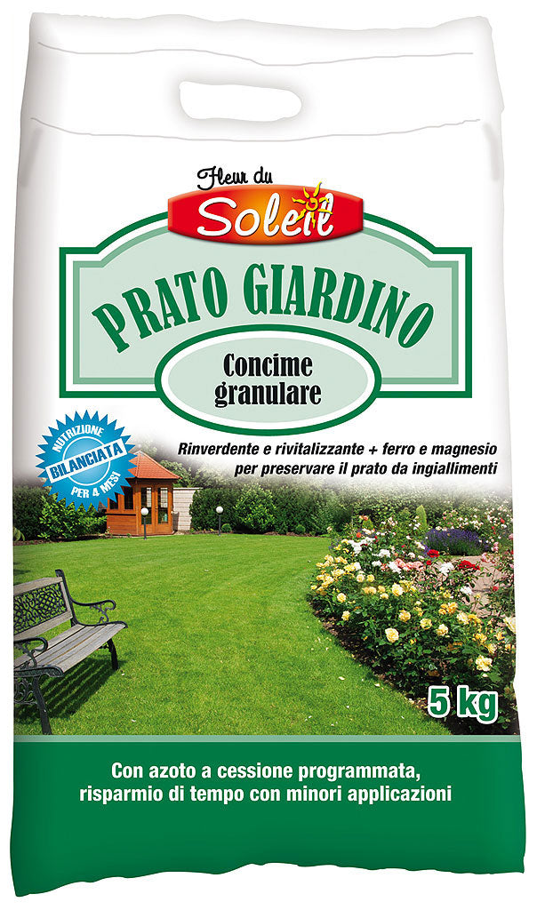 oncime granulare Prato Giardino della linea Fleur du Soleil di Raggio di Sole è un concime ad azione prolungata appositamente formulato (NPK 19-5-8) per garantire la corretta nutrizione del prato e del giardino. L’azoto inorganico contenuto nel prodotto viene assorbito velocemente dal tappeto erboso, favorendo la crescita e stimolando una rapida ripresa vegetativa e partenza anticipata, con effetto immediato anche con impieghi primaverli precoci. Ideale da impiegarsi soprattutto in presenza di temperature elevate.