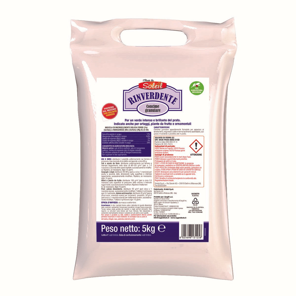 Concime granulare Rinverdente della linea Fleur du Soleil di Raggio di Sole è un concime granulare formulato per apportare la terreno microelementi (Ferro, Magnesio e Zolfo) facilmente assimilabili, particolarmente indicato per la prevenzione e la cura di squilibri nutrizionali che si manifestano con ingiallimenti fogliari da clorosi. Agisce come acidificante del terreno e nei tappeti erbosi, garantisce una notevole efficacia antimuschio eliminandone la presenza e prevenendone la formazione. Prodotto granulare di rapido assorbimento e facile impiego, indispensabile per prati, ortaggi, piante da frutto ed ornamentali. Apportatore di Ferro (solfato ferroso granulare Fe 12) e Manganese (Mn 0,6) per un’azione rinverdente rapida ed efficace, assicurando un verde intenso e brillante del prato.