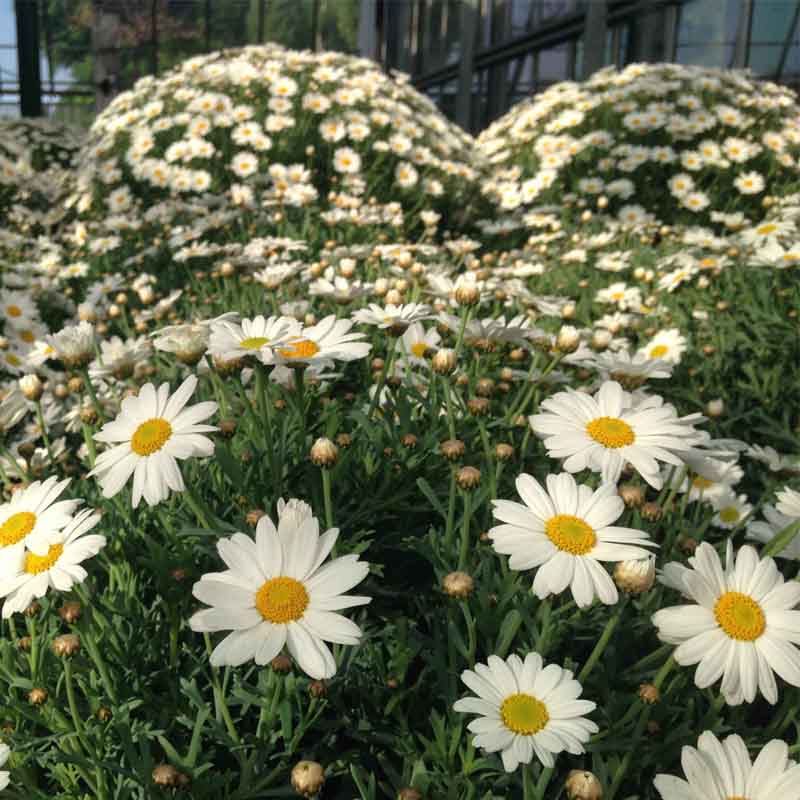 Il Leucanthemum Vulgare o Margherita Comune è una pianta perenne da esterno natia delle Isole Canarie ed appartenente alla famiglia delle Asteraceae. Si tratta di una pianta sempreverde erbacea alta sino a 1 metro che presenta fitte ramificazioni con foglie leggermente carnose, di forma lineare e profondamente dentate il cui colore è verde brillante. La fioritura è abbondante dalla primavera all’autunno quando all’apice degli steli che si innalzano sopra il fogliame si schiudono del gemme che producono fiori dai numerosi petali di colore bianco attorno alla corolla oro, molto simile alla pianta di Camomilla. La pianta è facile da coltivare purchè venga riparata dalle bassissime temperature e dai forti venti, può crescere rigogliosa sia in contenitore su balcone e terrazzo che in piena terra, utilizzata come singolo esemplare o in gruppo per aiuole fiorite; bisogna esporre la Margherita in zone particolarmente soleggiate benchè non disdegni il posizionamento in luoghi di ombra parziale. Si consiglia un terriccio fertile, ricco di sostanze organiche e ben drenato da irrigare frequentemente ma senza eccessi evitando i ristagni idrici.