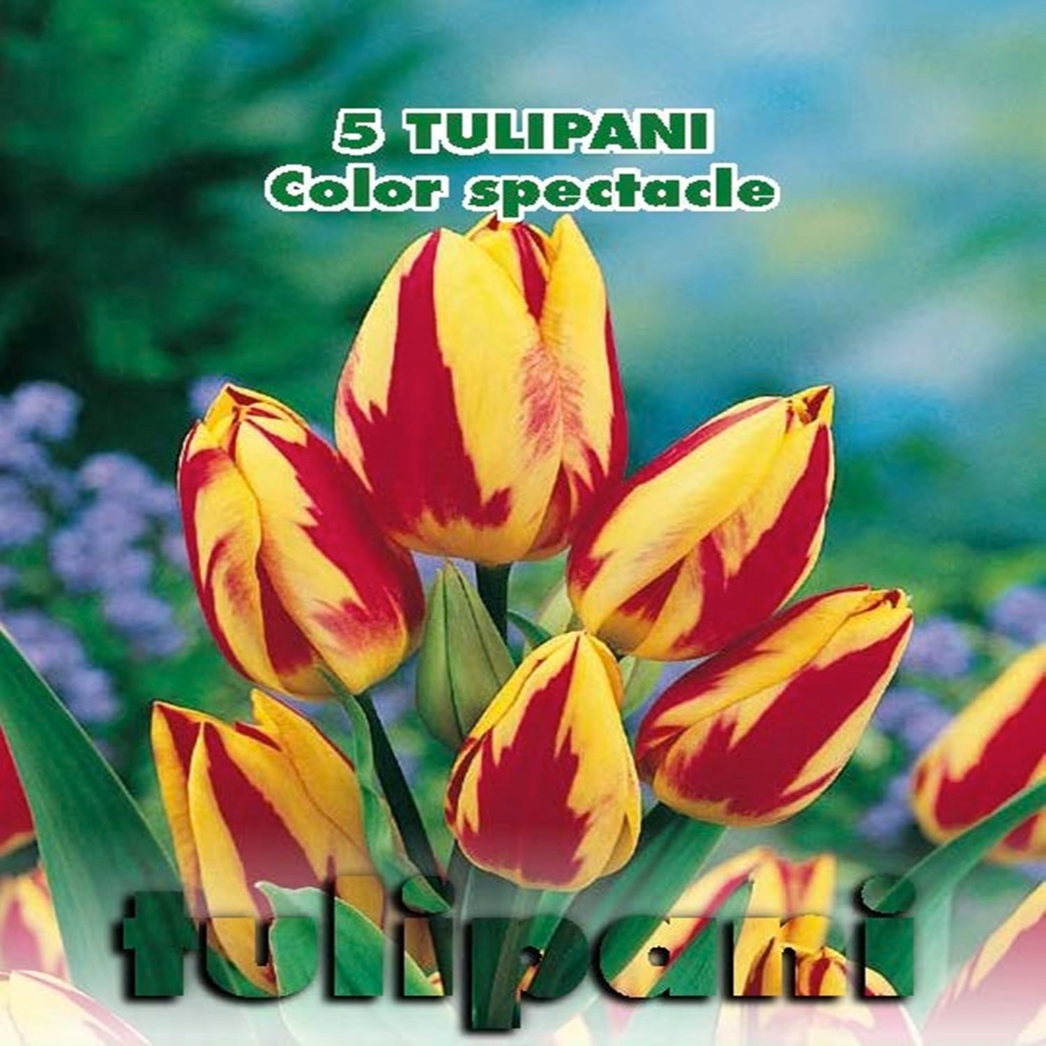 Crea uno spettacolo di colori nel tuo giardino con i bulbi di Tulipano Darwin Ibrido 'Color Spectacle'. Questa varietà è celebre per i suoi fiori di dimensioni impressionanti che presentano una base giallo canarino vivacemente fiammata di rosso. Gli steli, lunghi e robusti, rendono il 'Color Spectacle' una scelta eccellente sia per creare aiuole di grande impatto visivo sia come fiore reciso di lunga durata. La sua fioritura a metà primavera porterà un'ondata di allegria e colore.