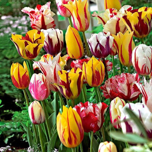 Porta nel tuo giardino il fascino dei capolavori olandesi del Secolo d'Oro con il nostro mix di Tulipani Rembrandt. Questa miscela celebra i famosi tulipani "rotti", noti per le loro spettacolari striature, fiammate e schizzi di colore contrastante su una base chiara. Le moderne varietà Rembrandt sono sane e stabili, replicando questo aspetto artistico unico. Il mix offre una gamma di combinazioni cromatiche, solitamente rosso, viola o rosa su fondi bianchi o gialli. Sono ideali per aiuole storiche, bordure e per creare bouquet dall'eleganza senza tempo.